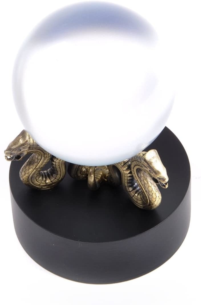 Found in the Department of Mysteries, this orb is a replica of Sybil Trelawney’s first prophecy, thought by Lord Voldemort to concern The Boy Who Lived. Warning: Please be aware that leaving glass in direct sunlight can pose a serious fire risk. Orb can be lifted from stand. Measures 5 inches in height. Comes with prophecy tag with chain included.